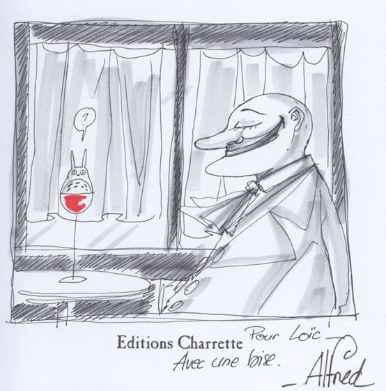 Me voici très étonné car effectivement, ce jeune homme a une excellente mémoire. Au mois de janvier, au festival d'Angoulême, je l'avais croisé tandis que je tapais la causette avec Vanyda en plein milieu de la foule d'un chapiteau. Il m'avait chambré en me disant que non content de draguer les jolies stagiaires, je m'attaquais désormais aux jolies auteurs. Je ne savais pas à cette époque que ce garçon était Alfred, le dessinateur bd que j'apprécie pour Abraxas ou Octave et le cachalot. J'ignore s'il se souvient des circonstances précises dans lesquels nous nous étions aperçus et je me contente de lui évoquer vaguement Angoulême. Quoi qu'il en soit, il me dit que c'est sans problème pour dessiner un totoro.
