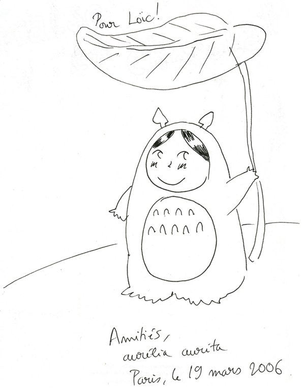 J’explique à Aurélia que j’étais sûr que son amoureux était Frédéric Boilet. Une intuition comme ça, à la lecture de sa nouvelle pour Casterman… Elle me demande si je le connais. Pas vraiment non, je lui ai écris un mail il y a deux ans pour qu’il réponde à mes questions pour Buta-connection puisqu’il est fan du Tombeau des lucioles. Trop de travail à l’époque, et si je n’ai pas repris contact c’est parce que ça n’a sûrement pas changé.