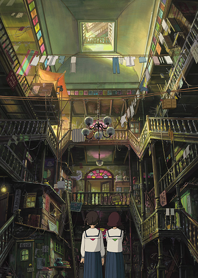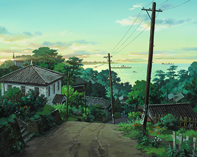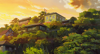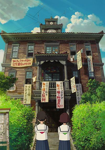 C’est Hayao Miyazaki qui a crée les deux bâtiments emblématiques de l’histoire. Le premier est la Villa des Coquelicots où habite Umi, tout en haut de la colline qui surplombe la ville et la mer. Maison traditionnelle japonaise, elle abrite les chambres à l’étage et les pièces communes au rez-de-chaussée. Sa particularité réside avant tout dans le mât qui se dresse au milieu du jardin, où Umi hisse tous les matins les pavillons maritimes en hommage à son père.