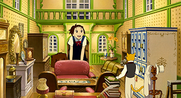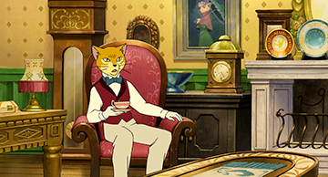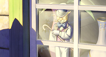 Pour le Bureau des chats, toutes sortes d'éléments européens ont été insérées. Le style, mais surtout les disproportions entre certains meubles ou objets, donnent l'impression d'une maison de poupée.