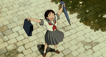 Kondô aime particulièrement sa jeune héroïne. On se rend compte que sa palette d'expression est très variée et tout en dégradé. En fait, les expressions de Shizuku semblent tout simplement très naturelles, évoquant irrésistiblement celles de Taeko dans Souvenirs goutte à goutte. Les autres personnages sont tout autant réussis, comme pour Yuko, au moins tout aussi attachante que son amie. Concernant le Character Design, on peut remarque un style proche de celui de Miyazaki. Mais celui-ci s'amuse souvent à caricaturer les expressions et attitudes de ses personnages, à étirer leurs traits pour rythmer son animation. En revanche Kondô opte pour un réalisme plus poussé dans la gestuelle et le comportement aboutissant à une animation peut-être moins dynamique mais plus sensible pour le spectateur qui s'identifie plus facilement aux personnages.