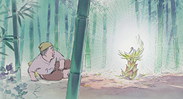 Okina, un vieil homme, est en train de couper du bambou dans une forêt. Il voit au loin une pousse dont semble émaner une lumière. Il s'approche et découvre en son centre une petite fille miniature à l'air sage et méditatif. Intrigué, il prend délicatement dans ses mains l'apparition et la ramène chez lui, dans une modeste maison où l'attend sa femme Ôna.
