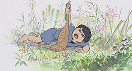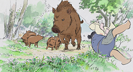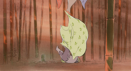 Okina décide un jour d'emmener sa petite fille dans les bambous. Echappant à sa surveillance, la princesse s'enfonce dans la forêt et tombe sur des marcassins. Attendrie, elle ne remarque pas que leur mère, furieuse, est en train de la charger. Heureusement, un adolescent, répondant au nom de Sutemaru, la sauve in extremis. Il la prend sous sa protection et tous deux rejoignent le groupe d'enfants du village. Tous entonnent une ritournelle joyeuse. Etonnamment, la princesse la connaît très bien et, très émue, poursuit même avec un couplet beaucoup plus mélancolique et écrase une larme.