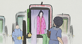 Elle se retourne vers ses parents pour leur dire adieu. Les apsaras lui déposent alors le manteau de plumes et la princesse semble à nouveau perdre toute volonté.