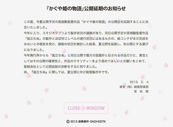 En septembre 2013, lors d’une nouvelle conférence de presse, Yoshiaki Nishimura a présenté ses excuses pour le retard pris par la production du film. Mais même à cette période, le producteur semble ne pas être tout à fait certain de leur capacité à le finaliser pour la nouvelle date. À cette occasion, Toshio Suzuki raillera en public le producteur sur l’avancement du projet.