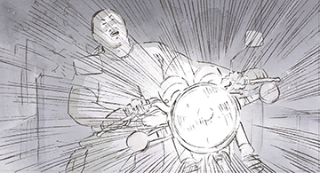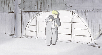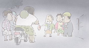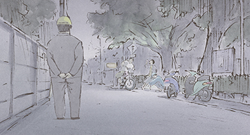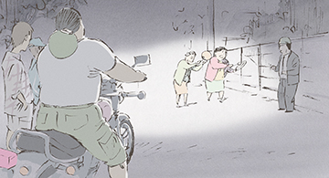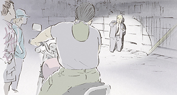 On remarquera enfin l'excellente idée de Takahata concernant le passage où Takashi doit faire face à un gang de motards. Dans cette scène, le style de dessin change alors radicalement en accord avec le changement de ton. On reconnaît ici une animation plus traditionnelle, où Takahata met en scène des personnages respectant les règles de proportions et nous apparaissent sans caricature ou simplification, comme dans une œuvre animée « traditionnelle ». La mise en scène est également plus conventionnelle, évoquant le film noir de gangsters. Ainsi toute la scène est nocturne et la seule lumière est artificielle, provenant d'un phare de moto. L'éclairage atteint de plein fouet Takashi, aveuglé, renforçant sa solitude face à la bande de motards se trouvant derrière la lumière aveuglante. La scène permet de bien sentir toute l'angoisse de la situation pour le personnage, le ton tranche très clairement par rapport au reste du film, au ton plus moqueur et plus léger.