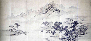 De même, un peu plus tard, au cours de ce périple, on peut voir le paysage, figuré par de fins traits noirs comme tracés à la plume. Ceci évoque la peinture japonaise au lavis et à l'encre, dite de style Nanga, inspirée de la représentation traditionnelle de paysages chinois.