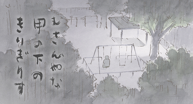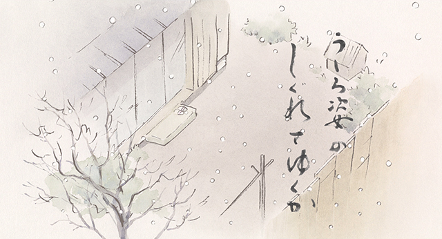 Ravi de voir tomber les premières neiges, Takashi propose de prendre une photo de famille. Personne ne lui prête attention ; ils sont absorbés par un téléfilm montrant des images spectaculaires d’un accident de montagne. Ignoré par sa famille, il marche dans la neige, le dos voûté, et murmure ce haiku. Il imagine sa silhouette s’effacer, comme s’il s’agissait d’une scène de cinéma. Ici, il ne pleut pas mais il neige. Ce haiku exprime toutefois parfaitement ce que ressent Takashi.
