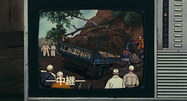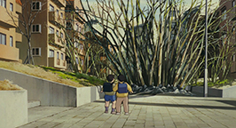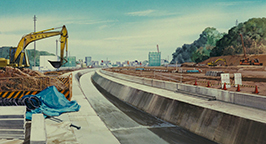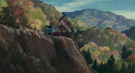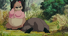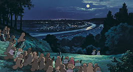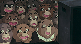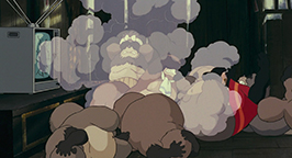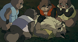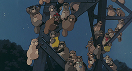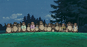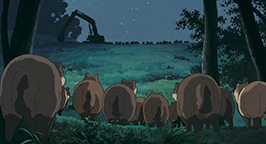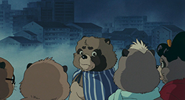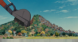 Alors que les tanuki, grimpant à un poteau, regardent en contrebas, ils ne peuvent qu'être sidérés : en effet leur montagne a bien disparu, rasée par les tractopelles des humains.