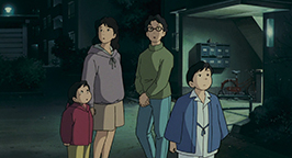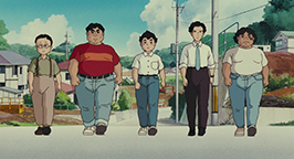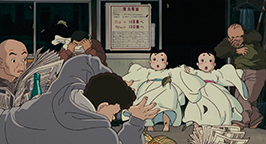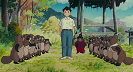 Enfin le jour de l'Opération Poltergeist est arrivé. Le temps est idéal pour les apparitions : nuageux et sans vent. Les tanuki se transforment en toutes sortes de fantômes et créatures fabuleuses des temps anciens. Ainsi, le soir-même, dans une proche banlieue de Tôkyô, trois jeunes garçons voient apparaître des ombres gigantesques.