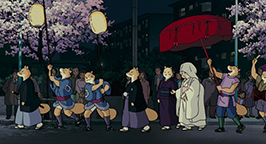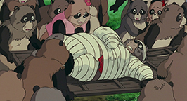 Soudain, c'est le drame, et le vieux Inugami Gyôbu, qui, contrôlant les apparitions, est soumis à une concentration extrême, meurt d'une crise cardiaque. Chez les tanuki, c'est la débandade, sous les applaudissements de la foule ravie, qui ne s'est en rien aperçue de la supercherie. Le défilé se termine aussi subitement qu'il avait débuté. Alors que les humains rentrent chez eux les tanuki pleurent le décès de leur maître. Tout à leur danse de la victoire, les tanuki ignorent les véritables réactions qu'ont eues les humains à propos de leur opération.