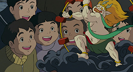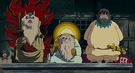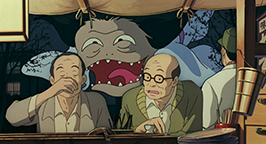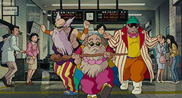 Au même moment, les anciens de Shikoku, déguisés en vieillards humains déjantés, arrivent à Tôkyô. La joie au temple est intense à l'arrivée de Tamasaburô, épuisé, venant les présenter. Les anciens en profitent pour faire une représentation spectaculaire, en se posant au milieu des tanuki après un vol plané.