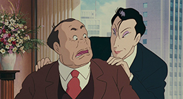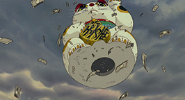 Tamasaburô et Kinchô, de leur côté, décident de faire venir le président qui les a bernés dans un faux restaurant créé grâce à leurs pouvoirs conjugués. C'est alors à leur tour de le berner, sous les yeux du renard, en lui dérobant une somme d'argent conséquente, destinée aux besoins futurs des tanuki de Tama.