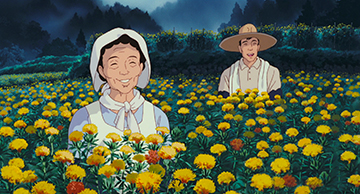 Il en va de même pour la récolte des fleurs de benibana (fleurs de carthame). La fleur jaune que cueille Teako est décrite avec une grande fidélité, comme les vêtements des agriculteurs ou la technique utilisée. Afin de tout savoir sur la fabrication du faux safran, Takahata décide de se rendre à Yamagata, accompagné par 17 collaborateurs dont Suzuki. Sur place, il interroge un récoltant de fleurs de carthame. Par la suite, il lira des dizaines d'ouvrages sur le sujet, écrira un vrai carnet de recherche et ira jusqu'à contacter un expert en la matière, en pleine production du film, afin de vérifier le procédé de fabrication. On retrouve ici le perfectionnisme de Takahata et sa volonté de pousser le réalisme jusqu'aux extrêmes.