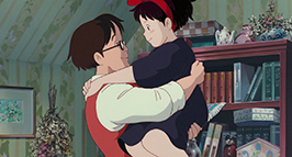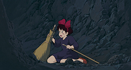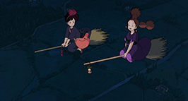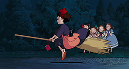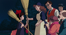 Le soir, dans le jardin de la maison, tout le village est réuni pour assister au départ de Kiki. Après une dernière discussion avec ses amies, la jeune sorcière va faire ses adieux à ses parents. A ce moment là, la mère se rend compte que sa fille voulait partir sur le petit balai qu'elle venait de fabriquer. Elle préfère lui donner son propre balai qui a fait ses preuves par tout temps. Un peu contrariée la fillette se résout à prendre le balai de sa mère qui, selon Jiji, est bien meilleur.