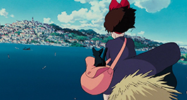 Le lendemain Kiki se réveille en riant hystériquement ; elle avait dormi dans le foin destiné à des vaches et celles-ci commençaient à lui lécher le pied ! Après s'être excusée auprès des vaches de s'être endormie dans leur déjeuner, Kiki ouvre la trappe du toit du wagon et voit pour la première fois la mer. Elle est émerveillée, contrairement à Jiji qui pense que ce n'est qu'une grande flaque d'eau. C'est alors que la jeune fille remarque sur sa droite une grande ville portuaire au loin. La vue est magnifique et la jeune sorcière se demande alors si elle ne pourrait pas s'y installer.