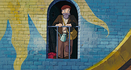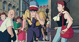 Kiki en regardant de près aperçoit Tombo accroché au dernier amarre qui vient de se rompre. Paniquée, la jeune sorcière part en courant vers les lieux de la catastrophe. Dans la rue elle aperçoit le dirigeable qui dérive. C'est alors qu'elle remarque un vieil homme avec un balai. Elle le lui emprunte mais peine à décoller avec. Quand elle y arrive enfin, elle a encore plus de difficultés à le manier.