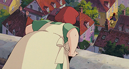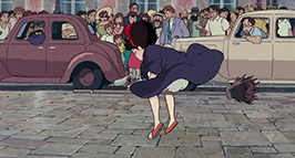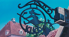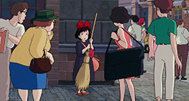 Après avoir décollé du train, Kiki se dirige vers le point le plus élevé de la ville : le clocher. Là le gardien lui apprend qu'il n'y a pas eu de sorcières vivant ici depuis un moment. La jeune fille fait alors son choix : ce sera cette ville ! Elle se met alors à survoler les rues sur son balai au grand étonnement des citadins. Quand Jiji lui fait remarquer que tout le monde les regarde, elle lui répond de sourire et de faire bonne impression. Malheureusement elle manque de se faire percuter par un bus sous un porche et provoque presque un accident. Atterrissant en catastrophe, elle se présente aux personnes présentes autour d'elle. Celles-ci semblent gênées et partent rapidement. Arrive alors un agent de police qui menace de l'emmener au poste.