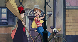 Heureusement, le policier est interpellé par quelqu'un qui crie au voleur. Profitant de son absence, Kiki se sauve par une petite rue. Là elle est rattrapée par un garçon en vélo, nommé Tombo : c'est lui qui l'a aidé en criant au voleur quelques instants plus tôt. Il voudrait devenir son ami mais la jeune fille, qui le trouve impoli, ne l'entend pas de cette oreille et s'en va. Tombo regarde avec fascination Kiki s'envoler avec son balai.