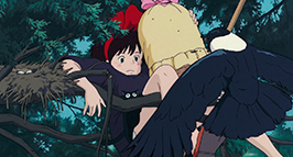 Mais Kiki, dans sa livraison, est malmenée par une rafale de vent et tombe dans une forêt de pins. Elle atterrit près d'un nid de corbeau. L'oiseau, furieux, la chasse de l'arbre à grands coups de bec. La jeune sorcière s'excuse et reprend rapidement son envol. Quelques instants plus tard, Jiji se rend compte que la peluche n'est plus dans sa cage. Paniquée, Kiki retourne à son point de chute mais les corbeaux lui réservent un accueil houleux et la jeune fille est obligée de battre en retraite. Jiji propose d'aller chercher la peluche à la tombée de la nuit mais la sorcière serait en retard. Il lui vient alors une idée : Jiji remplacera la peluche le temps qu'elle la retrouve.