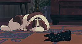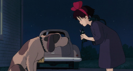 Arrivée à destination, Kiki sonne et le jeune garçon à qui était destinée la peluche, accourt pour s'emparer de son cadeau. La livraison terminée, Kiki s'empresse de partir chercher la vraie peluche. De son côté Jiji, qui fait de son mieux pour rester immobile, n'est pas du tout rassuré : il y a un énorme chien dans la maison.