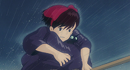 L'instant du départ est enfin arrivé : Kiki monte sur son balai, se concentre puis décolle maladroitement montrant que sa maîtrise du vol est loin d'être parfaite. En vol, Kiki annonce à Jiji qu'elle a décidé d'aller vers le sud afin de voir l'océan. En chemin, ils rencontrent une jeune sorcière en fin de formation. Cette dernière lui explique la difficulté de s'installer dans une ville étrangère mais ajoute que, comme son pouvoir est de prédire l'avenir, elle n'a pas rencontré de gros problèmes. Les deux jeunes filles se quittent lorsque la seconde arrive au-dessus de sa ville. Kiki commence alors à se demander quelle est sa spécialité de sorcière ; mais elle est interrompue dans sa réflexion par un orage qui la force à se réfugier dans un wagon rempli de paille. Ne se posant aucune autre question elle s'endort rapidement. Le train se met alors en marche.