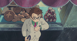 Un peu plus tard, en prenant le thé, la vieille dame s'inquiète de savoir si Kiki n'est pas en retard pour sa soirée, mais la jeune fille en regardant l'horloge de la cuisine la rassure. La vieille dame lui explique alors que l'horloge de la cuisine retarde de 10 minutes. Kiki est prise de panique. Heureusement le plat est cuit et elle peut partir livrer sa commande. Mais dehors le temps a changé, un orage éclate et Kiki est littéralement arrosée. Quand elle arrive à destination, Kiki est accueillie froidement par la petite-fille de la vieille dame qui se plaint de recevoir une fois de plus une de ses affreuses tartes. La jeune sorcière repart affectée. Il est déjà 18 h passées et Tombo attend Kiki devant la boulangerie. Bientôt il se résigne à partir sans elle. Mais Kiki ne tente pas de le rattraper. De toute façon, elle est toute trempée et elle ne peut pas se présenter dans cet état à la soirée.