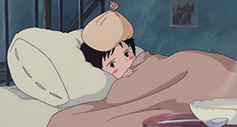 Le lendemain matin, Kiki ne s'est pas réveillée et Mme Osono s'inquiète en voyant Jiji gratter à la fenêtre de la chambre de sa maîtresse. En fait Kiki n'est pas sortie de son lit car elle a attrapé froid. Osono revient un peu plus tard lui apporter des flocons d'avoine et lui annonce que Tombo est passé à la boutique ce matin. Il repasserait la voir dans l'après midi, mais connaissant Kiki, Mme Osono a poliment refusé.