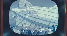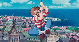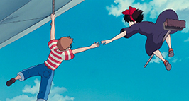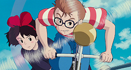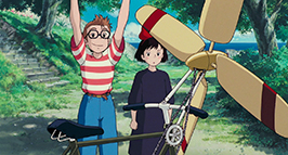 Kiki comprend alors qu'Osono avait planifié cette rencontre. Tombo en profite pour lui montrer dans son garage sa machine volante (un vélo à hélice auquel il manque encore les ailes et le fuselage). Il propose à Kiki d'aller voir le dirigeable qui s'est posé près de la plage, avec sa dernière invention. Kiki accepte et chevauche le porte-bagages. Dans la descente, ils peuvent déjà voir le dirigeable arrimé sur la plage.
