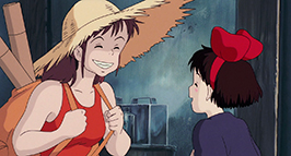 Après s'être fait refuser l'accès dans tous les hôtels de la ville, Kiki et Jiji en arrivent à discuter de la possibilité de repartir chercher une autre ville. C'est alors qu'une femme enceinte sort de la boulangerie proche. Une cliente y a oublié la tétine de son bébé et la boulangère s'apprête à partir la rattraper pour la lui rapporter. Kiki se propose d'y aller à sa place. La commerçante, qui s'appelle Osono, est très surprise de voir la jeune fille chevaucher son balai et se jeter dans le vide, pour aller rejoindre la cliente avec son landau.