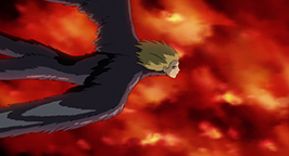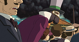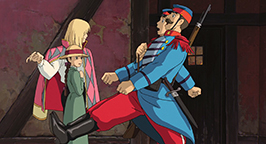 Au même moment, des gardes envahissent simultanément « les domiciles » de Hauru, à ses trois adresses différentes. Mais ils débarquent tous dans des lieux vides. Le château ambulant n'est plus là. Pendant ce temps l'engin volant termine sa course en s'écrasant dans la pièce principale du château, venu à la rencontre de Sophie.