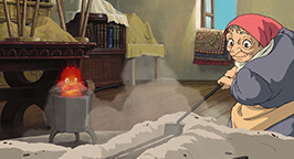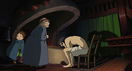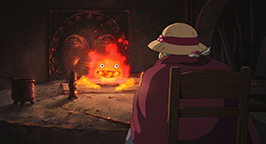 La porte refermée, Sophie se retrouve dans un un foyer délabré, bien loin de l'idée qu'elle pouvait se faire de l'intérieur du château. Sophie s'écroule sur une chaise près de la cheminée, lorsque les braises encore chaudes de l'âtre prennent vie et lui parlent. Il s'agit en fait de Calcifer, démon du feu. Il explique à Sophie qu'il est exploité par Hauru, à cause d'un sortilège dont il est prisonnier. Vivant dans le foyer de la cheminée, c'est lui qui fait bouger le château. Lui-même entité magique, Calcifer sait que Sophie est sous le coup d'un charme et qu'elle ne peut pas parler de son sortilège. Pour les mêmes raisons, Calcifer ne peut pas parler du sien. Les deux personnages passent alors un marché : si Sophie découvre le secret qui lie Hauru à Calcifer, ce dernier, à son tour, la libérera de sa malédiction.