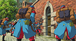 Le lendemain, Sophie et Marko traversent la porte du Port et vont au marché du Port. Sur la berge, les habitants observent le fleuron de leur flotte navale qui rentre en un piteux état. Sophie remarque les hommes-caoutchoucs mêlés à la foule. Ils sont à la recherche de Sophie et, bien sûr, de Hauru. Sophie et Marko s'enfuient tandis que l'armée ennemie des habitants de la porte du Port lâche des tracs de propagandes et bombarde le bâtiment à quai. La guerre s'intensifie et se rapproche des villes.