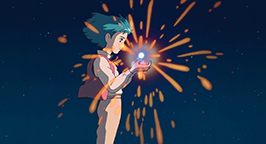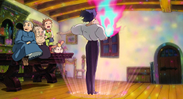 La sorcière des Landes remet Calcifer à Sophie. Celle-ci le place avec précaution sur Hauru au niveau de la poitrine. Tous les deux fusionnent. Le charme est rompu. Calcifer reprend vie et dans un éclair, s'envole dans les cieux en remerciant Sophie de l'avoir libéré. Hauru reprend peu à peu conscience, la malédiction qui pesait sur lui est également levée.