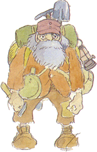 Oncle Pom est un vieux mineur qui vit en ermite dans les tunnels et les grottes de la mine désaffectée, loin de la confusion et des dangers qui sévissent à la surface. Connaissant bien les roches, il renseigne les deux enfants sur les pouvoirs de la pierre de lévitation et leur confirme l'existence de Laputa, à la plus grande joie de Pau.