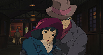 Le lien entre ces scènes, c’est principalement Jirô lui-même qui le fait, puisque Miyazaki fait là encore un pari audacieux : c’est ce personnage qu’il suivra durant toute la durée du film. Les seules entorses sont trois courtes scènes, toutes centrées sur Nahoko : lorsqu’elle crache du sang, lorsqu’elle reçoit la lettre de Jirô au sanatorium et qu’elle s’enfuit, et quand elle quitte définitivement Jirô à la fin du film. Jirô est donc le fil rouge, filmé dans des scènes du quotidien, probablement parmi les plus belles et les plus intimes de Miyazaki, comme leur mariage presque onirique, où Nahoko apparaît de manière prophétique tel un fantôme. Ou encore cette scène à la fois poignante et si juste où Jirô fume une cigarette tout en tenant la main de sa chère aimée, tous deux conscients du poison qu’est cette fumée pour la jeune femme, mais aussi de leur amour impossible et forcément condamné. Pour la première fois dans sa carrière, le réalisateur met en scène des moments d’amour, avec plusieurs baisers échangés entre nos deux héros.