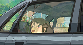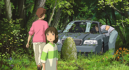 Sur la route, le père aperçoit au loin leur nouvelle maison et prend un sentier qu'il pense être un raccourci. Le chemin est très accidenté et Chihiro est secouée sur le siège arrière de la voiture. Elle remarque en bordure du sentier d'étranges statues qui semblent les guider. Mais le chemin est en fait une impasse et le père doit arrêter la voiture devant un mur de ciment rouge percé d'un long et sombre tunnel. Une nouvelle statue semble en garder l'entrée. Le père de Chihiro est curieux de découvrir ce qui se cache au bout de ce mystérieux tunnel. Il rassure sa femme, lui expliquant qu'il a laissé les clefs de la maison ainsi que des instructions aux déménageurs.