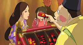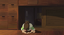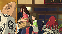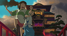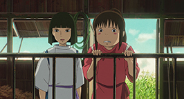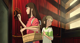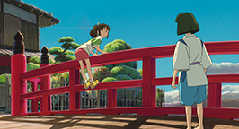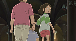 La mère propose à Chihiro de s'attabler mais la fillette, contrariée par le sans-gêne de ses parents, refuse. Intriguée, elle préfère visiter le village apparemment inhabité. Bientôt Chihiro se retrouve face à un pont conduisant à un immense bâtiment. Distraite par un bruit, elle se penche pour voir en contrebas et voit passer un train. Le soleil se couche déjà. En relevant la tête, elle aperçoit un jeune homme qui la somme de repartir là d'où elle vient.