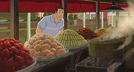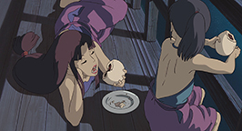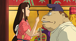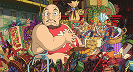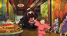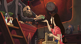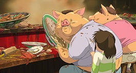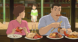 Se laissant guider par sa faim, le père découvre enfin le restaurant qui dégage cette si bonne odeur. Des mets appétissants sont posés sur le comptoir et les parents de Chihiro, après avoir appelé en vain un serveur, commencent à se délecter des plats encore fumants, bien décidés à régler la note lorsqu'un employé du restaurant se présentera.