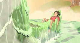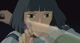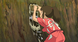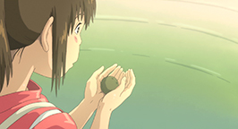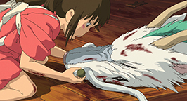 Chevauchant le dragon Chihiro a soudain un flash-back, elle se revoie chevauchant un dragon sous une eau limpide. Finalement tout deux atterrissent dans la chaufferie. Kamajî en voyant l'animal mythique n'a pas beaucoup d'espoir. Il explique à Chihiro que Haku est victime d'un empoisonnement. Sen prend alors la boulette amère que lui a donnée le dieu des eaux, la coupe en deux et lui enfourne une moitié dans la gueule l'obligeant à l'avaler.