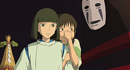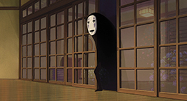 Sen, en traversant pour regagner l'établissement des bains, se retourne mais ne voit pas Haku. Elle aperçoit cependant un dragon vert et blanc s'éloigner dans le ciel. De retour aux bains, Sen est rapidement mise au travail : elle doit cirer le parquet. La petite fille se met donc à la tâche avec ardeur, même si elle semble beaucoup moins efficace que les autres serviteurs. Alors qu'elle s'apprête à jeter l'eau sale à l'extérieur, Sen aperçoit un spectre masqué, sans visage, qui attend dehors sous la pluie. Pressée, elle lui explique qu'elle laisse la porte vitrée ouverte pour qu'il puisse rentrer s'il le désirait.