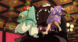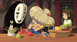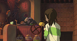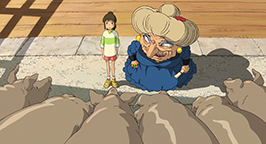 Les noiraudes voyant la fillette accomplir la tache de leur collègue, s'écroulent une à une à la grande surprise du vieil homme qui les sermonne. Soudain une porte dérobée s'ouvre et une employée rentre dans la salle pour apporter le repas de Kamajî. Discutant avec le vieil homme, elle ne remarque pas tout de suite Chihiro.
