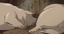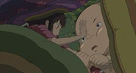 Le lendemain matin, de très bon heure, Sen est réveillée par Haku qui l'invite à le rejoindre au pont pour qu'il puisse l'accompagner voir ses parents transformés en cochons. Sen les découvre endormis pour avoir trop mangés, ne répondant pas aux appels de Chihiro.
