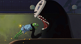 Pendant ce temps là, une grenouille avide d'or s'aventure dans les bains à la recherche des pépites qui auraient pu se glisser entre les lames du plancher. Le sans-visage, qui l'a observé, a compris ce qu'elle cherche et lui tend de l'or qu'il fabrique spontanément dans ses mains. La grenouille appâtée s'approche pour prendre l'or, mais elle est attrapée et ingurgitée par le spectre. Un employé, qui garde les lieux la nuit, a entendu du bruit et découvre le sans-visage. Ce dernier lui offre de l'or en lui expliquant, avec la voix de la grenouille qu'il vient de gober, qu'il s'agit d'une avance pour le repas qu'il voudrait qu'on lui prépare...