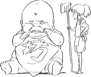 Une armée de boules de suie, évoquant irrésistiblement les noiraudes de Mon voisin Totoro, et qui portent avec leurs frêles membres des boulets de charbon pour alimenter le fourneau du temple. Elles adorent les Kompeitô (friandises en forme d'étoiles multicolores). Leur condition d'esclaves ouvre les yeux à Chihiro qui prend conscience de la dureté du labeur et de la vie.