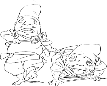 Les travailleurs grenouilles sont des personnages comiques et curieux. Ils possèdent une grosse voix et sont très attirés par l'or. Ils s'occupent principalement de préparer les repas pour les dieux.
