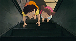 Monsieur Kusakabe leur donne une nouvelle mission : ouvrir les fenêtres du premier étage. De retour à l'intérieur, Satsuki et Mei sont à la recherche de l'escalier qui même vers l'étage supérieur de la maison. Elles le découvrent caché derrière une porte. L'escalier est sombre et, de plus, un nouveau gland tombe du haut des marches. Les filles attribuent à nouveau ce phénomène aux noiraudes. Elles lancent un cri pour annoncer leur arrivée et grimpent l'escalier avec prudence. Au sommet, elles aperçoivent aussitôt des formes bouger dans la pénombre. Satsuki se précipite pour ouvrir les fenêtres en grand. Mei, à la suite de sa sœur, a juste le temps d'assister à une nouvelle migration de noiraudes qui se glissent dans une fissure du mur. Satsuki n'a rien vu et quand elle se retourne, la pièce est vide. Par la fenêtre, elle explique à son père ce nouveau phénomène. Dans le jardin, celui-ci, aidé par le conducteur, a bien du mal à porter un meuble encombrant. Satsuki descend les rejoindre pour leur prêter main forte. À l'étage, Mei reste seule dans la pièce, immobile. Elle s'approche doucement de la fissure et glisse un doigt à l'intérieur. Aussitôt, une nuée de petites boules noires en jaillit et disparaît presque instantanément sous le toit, laissant Mei médusée.