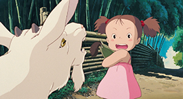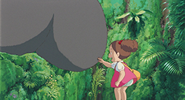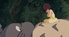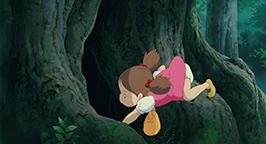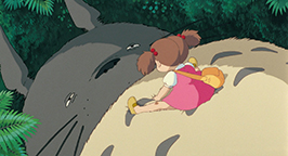 Elle glisse jusque dans une immense grotte à l'intérieur même de l'arbre. Reprenant ses esprits, elle découvre l'étrange univers dans lequel elle vient d'arriver. Les parois de l'immense salle sont tapissées de nombreuses espèces de mousse, de fleurs et de plantes aujourd'hui disparues. Tout un tas d'insectes la peuple. Mei n'est pas au bout de ses surprises : alors qu'elle a perdu la trace des deux petites créatures, voilà qu'elle se retrouve face à une troisième encore plus grosse ! Blottie dans une cavité, l'imposante créature grise se repose, tournant le dos à la fillette. La discrétion n'est décidément pas la principale qualité de Mei. Un sourire espiègle sur le visage, elle commence à chatouiller la queue de l'hôte des lieux. Tiré de son sommeil, il réagit avec douceur en se retournant sur le dos. De plus en plus effrontée, Mei escalade son ventre poilu et se dresse dessus. Il fini par ouvrir les yeux. Il ne semble pas dérangé par la présence de la fillette sur son ventre ni par sa hardiesse lorsqu'elle commence ensuite à lui chatouiller le nez ! Brusquement, il se met à éternuer. Mei est toute contente ! Elle tient ensuite absolument à attirer son attention pour lui soutirer son nom. Pour toute réponse, elle récolte les bayements de la créature dans lesquels elle semble reconnaître le nom « Totoro ». Mei conclut qu'il s'agit là de son nom ! Mais les bâillements incessants de Totoro finissent par avoir raison de l'énergie débordante de l'espiègle fillette qui finit par s'endormir sur son ventre douillet. La journée s'écoule lentement, jusqu'au retour de Satsuki de l'école.
