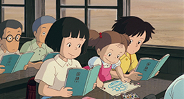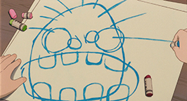 Aujourd'hui, alors que Monsieur Kusakabe est en déplacement à son université, Mei est confiée à Grand-mère pendant que Satsuki est à l'école. Mais en plein milieu des cours de Satsuki, Mei arrive à l'école, accompagnée par Grand-mère. Elle ne veut pas rester avec la voisine, et têtue, elle a contraint la vieille dame à l'emmener voir sa sœur. Mei finira le reste de la journée en classe, assise entre sa sœur et sa voisine Michiko. Elle est encore trop petite pour suivre le cours. Elle s'applique donc à faire un dessin de Totoro peu flatteur pour la créature !