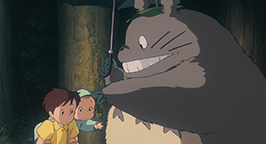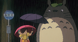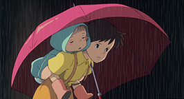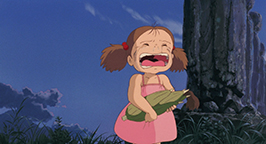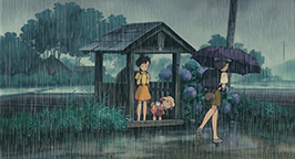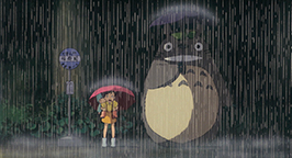 La tête seulement protégée par une feuille, la pluie tombe sur le gros animal. Figé, il regarde les gouttes d'eau lui tomber sur le bout du nez. Satsuki lui prête poliment le parapluie réservé pour son père. Un peu surpris par l'objet que lui tend Satsuki, Totoro ne tarde pas à en saisir l'utilité et le place au-dessus de sa tête. Il n'est pas au bout de ses découvertes. Le bruit créé par les gouttes qui tombent sur le parapluie le met en joie. Il prend son élan et bondir en l'air. Le choc de son atterrissage fait tomber les gouttes de pluie attachées sur les feuilles des arbres. Une véritable averse tombe sur les fillette et Totoro. Son grondement de joie réveille Mei.